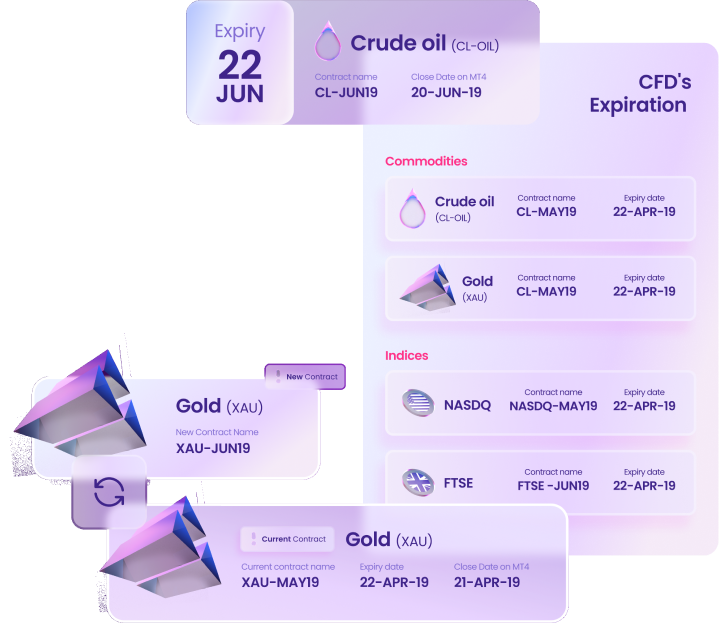 Below are CFD expiry dates linked to specific assets. You must choose between closing any open position(s), letting them expire, or rolling them over. If rolled over, any existing pending order(s) (Stop Loss, Take Profit, Entry Stop, or Entry Limit) will be adjusted symmetrically (point-for-point) to reflect the price difference between expiring and new contracts.